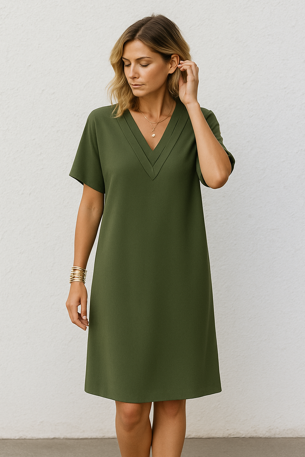 Deze jurk valt losjes rond het lichaam en accentueert op subtiele wijze het silhouet. De diepe V-hals met gelaagd detail voegt een moderne flair toe. De soepele snit zorgt voor een luchtige beweging bij elke stap. Afgeronde zijkanten creëren een vloeiende, vrouwelijke vorm.