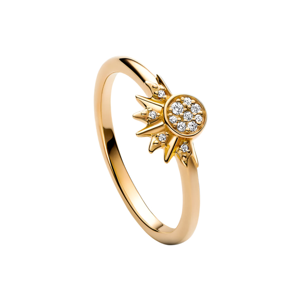 Deze set van twee ringen toont een perfecte symmetrie tussen zon en maan, beide rijkelijk versierd met sprankelende accenten. De maanring straalt koel zilverblauw met stervormige omlijsting, terwijl de zonring in warm goud fonkelt met een stralend middelpunt. De ringen nestelen elegant in elkaar, maar kunnen ook los gedragen worden. Het silhouet is krachtig en speels, met hemelse flair.