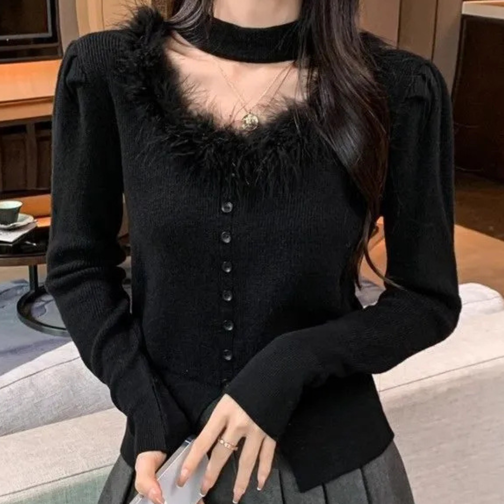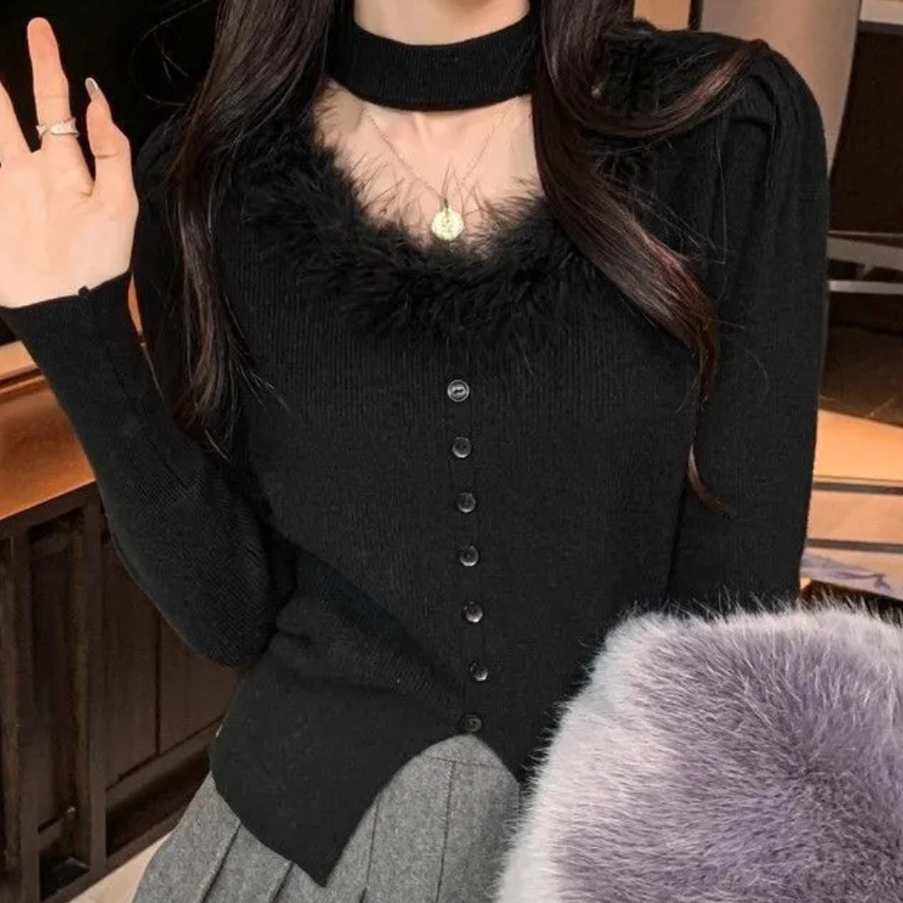 De Delara knitted top combineert verfijning met een edgy uitstraling. De aangesloten pasvorm en delicate faux fur-details creëren een subtiele balans tussen luxe en moderniteit. De elegante knoopsluiting en de opvallende halslijn maken dit stuk een statement in elke garderobe.
