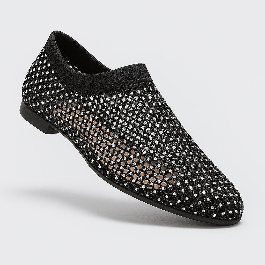 Een slank, afgerond silhouet omlijst door een sprankelend patroon van kristallen. De strakke lijnen en sokachtige pasvorm sluiten nauw aan rond de enkel. Elk detail straalt kracht en verfijning uit zonder in te leveren op comfort. Deze Flats laten je voeten ademen en schitteren tegelijk.