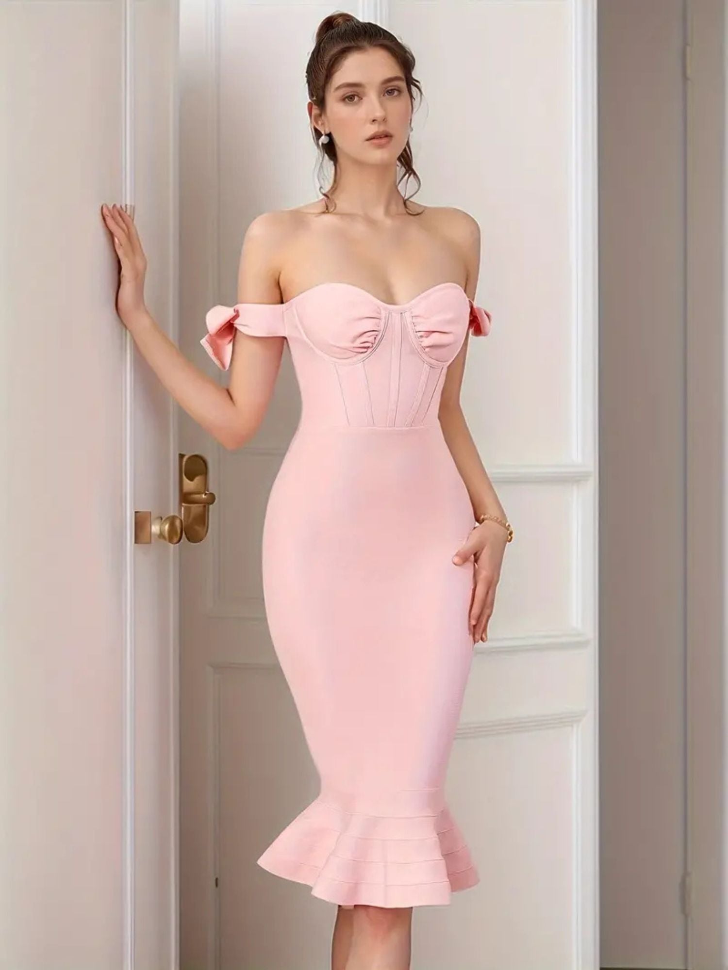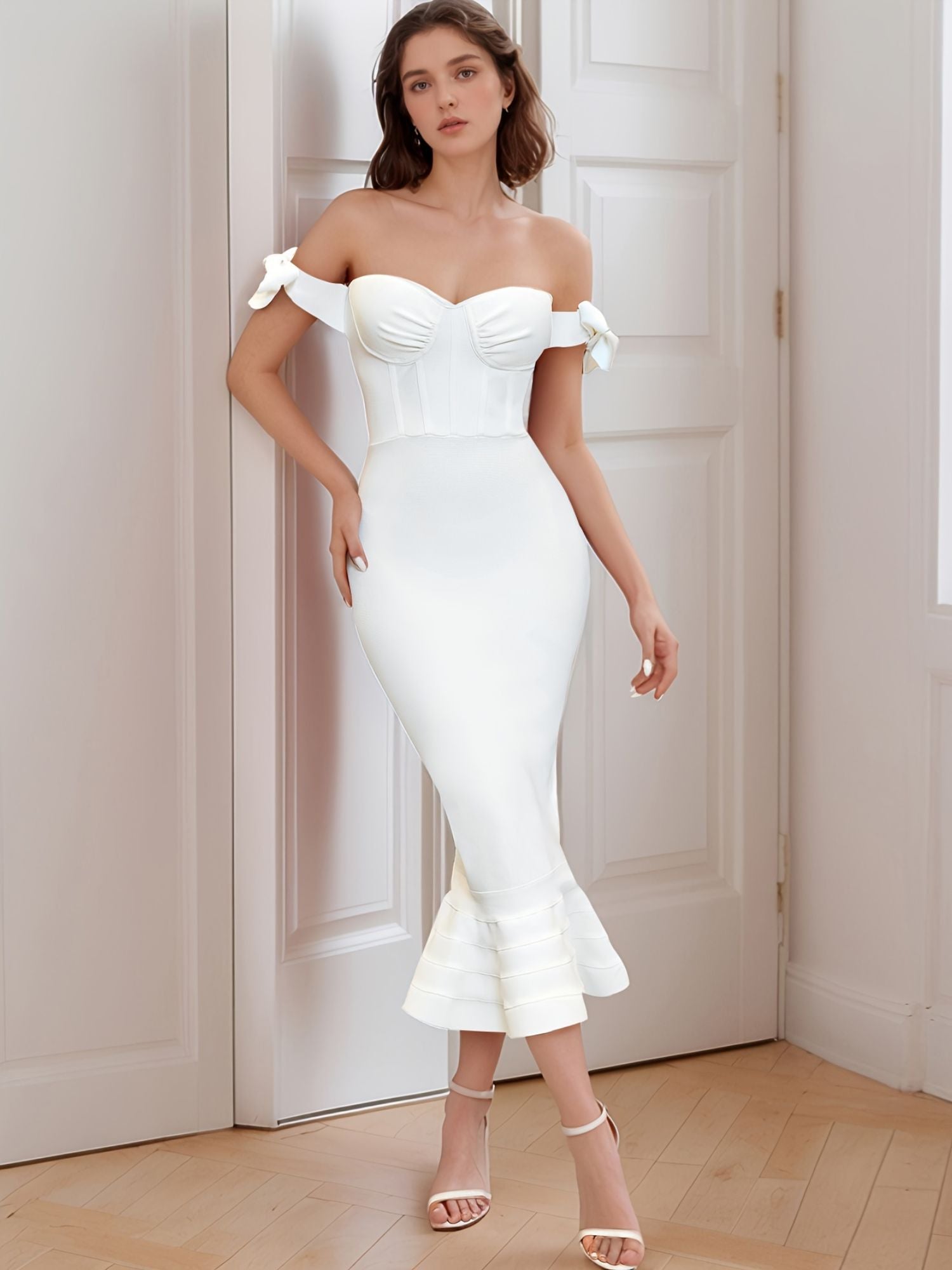 OFF-SHOULDER MERMAID MIDI-JURK MET KORSETLIJFJE EN STRIKDETAIL