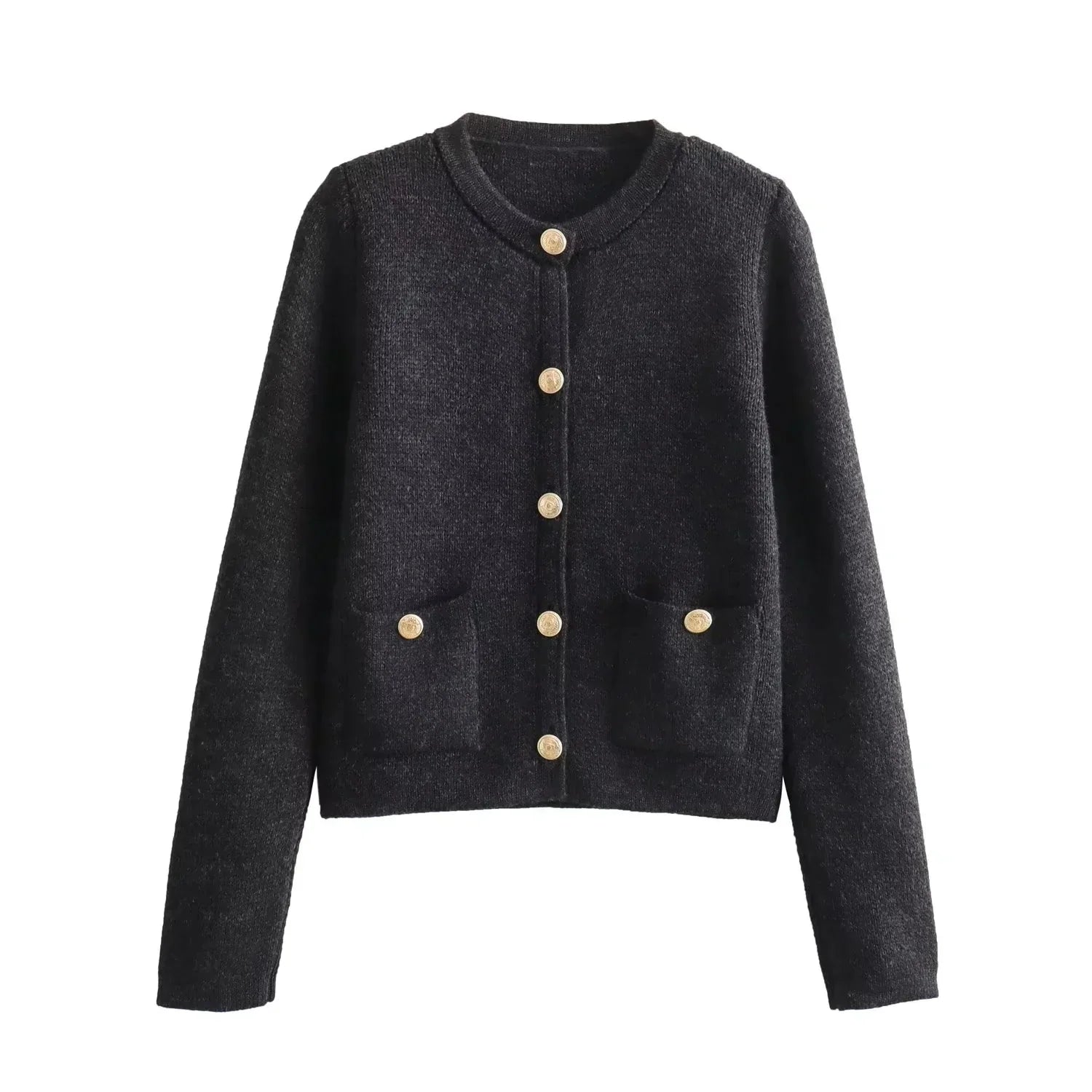 Een veelzijdig gebreid vest voor dames, ontworpen om stijl en comfort te bieden. Met lange mouwen en een aansluitende pasvorm is dit vest perfect voor een moderne, verfijnde uitstraling. De knoopsluiting en subtiele zakken voegen zowel functionaliteit als elegantie toe, waardoor het geschikt is voor allerlei gelegenheden.