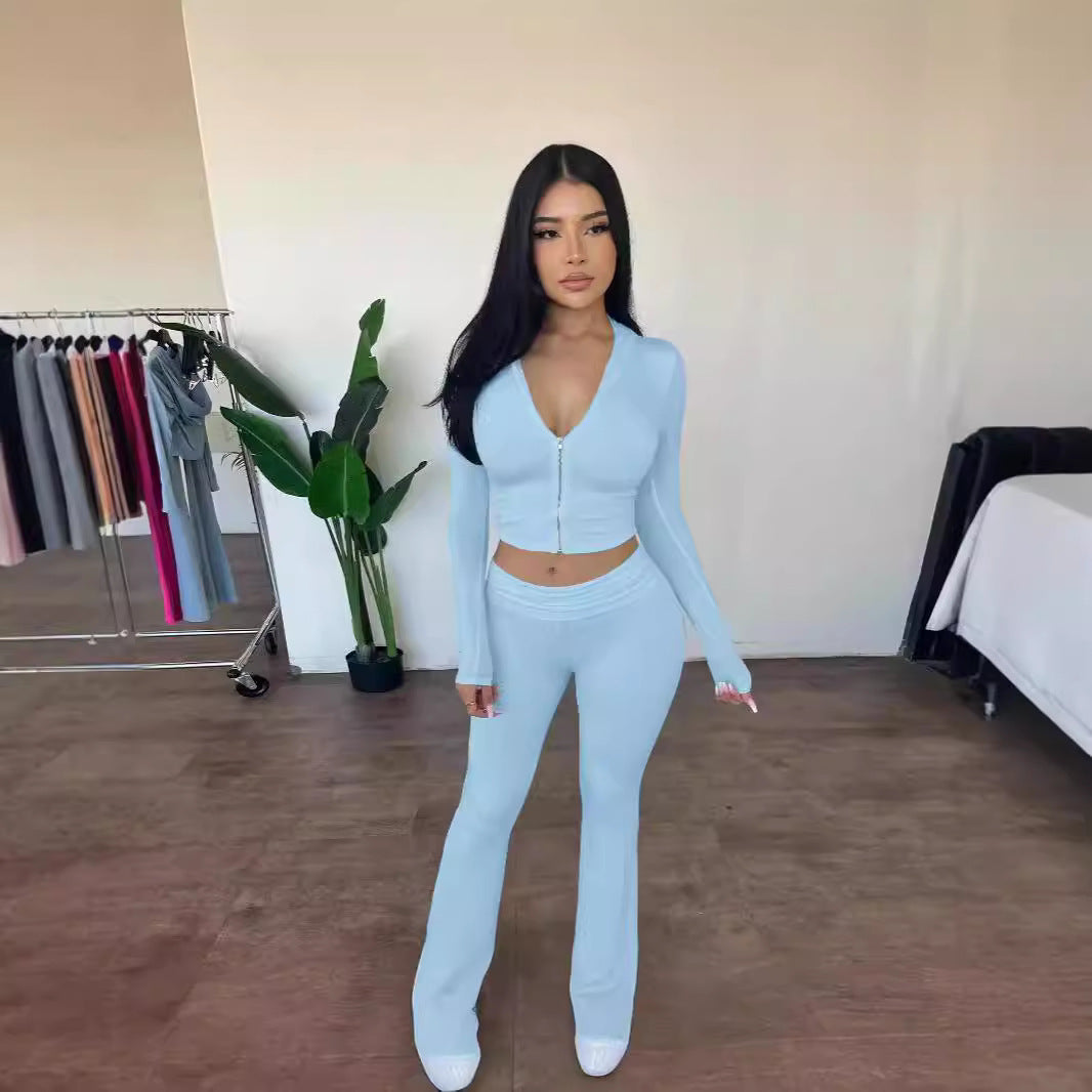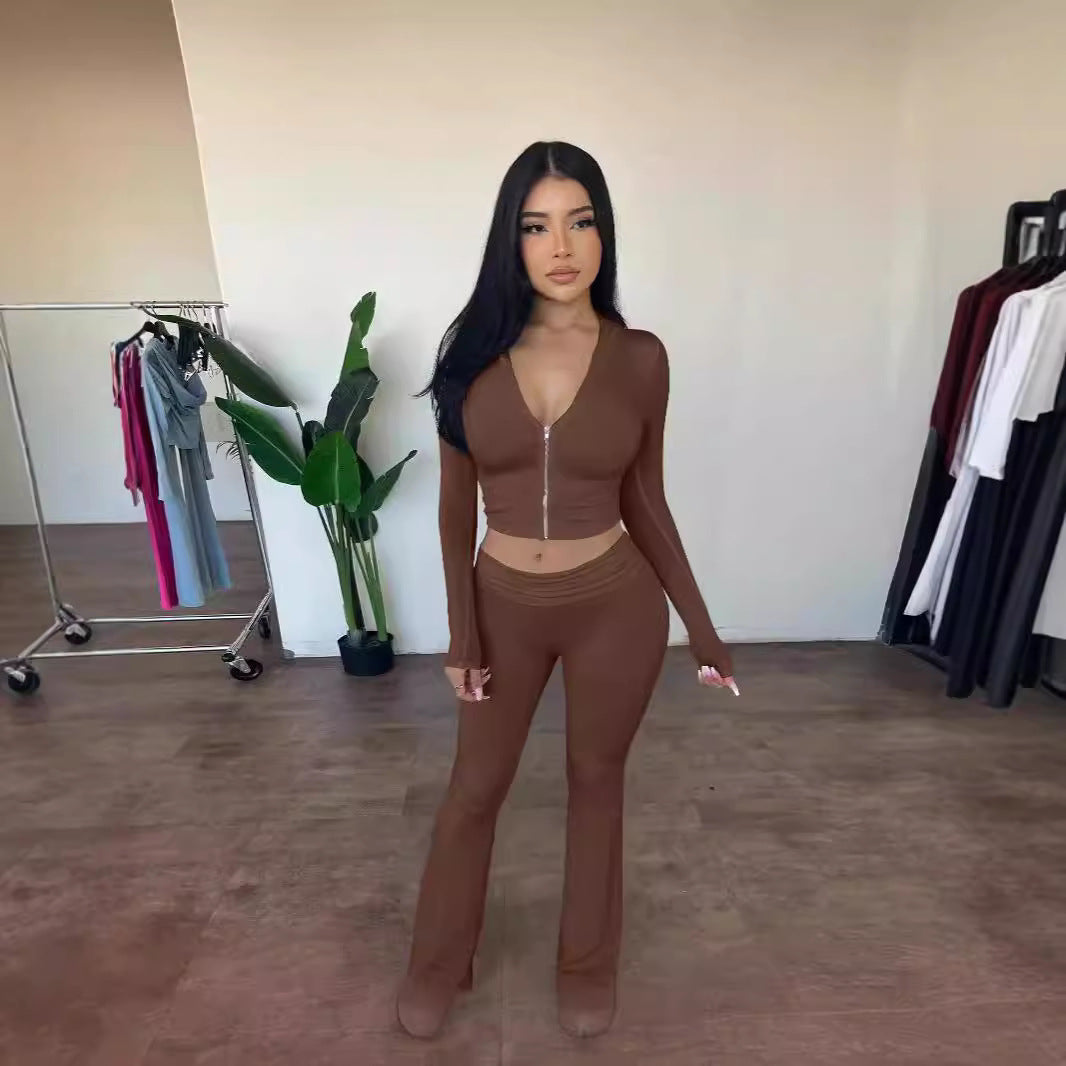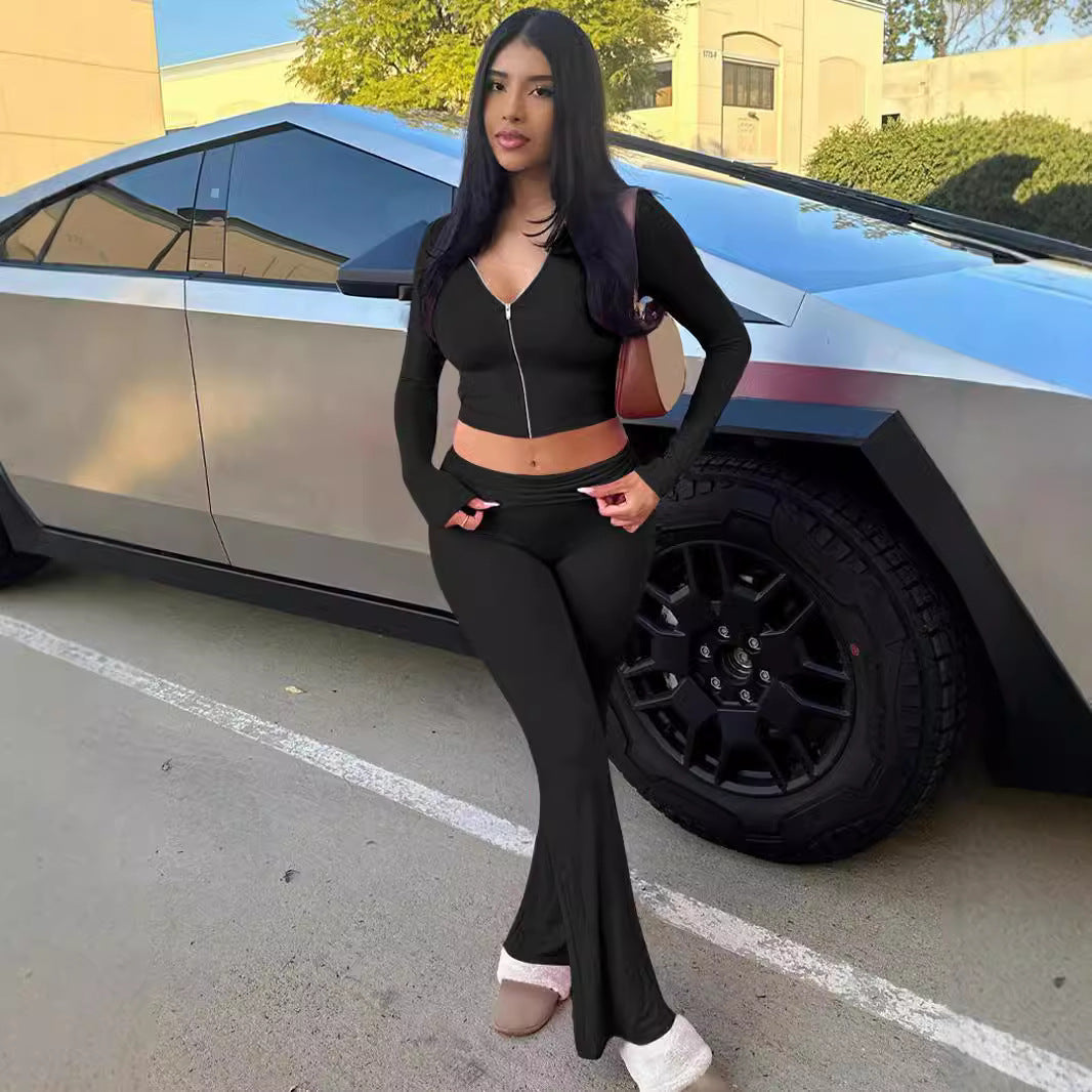 Dit tweedelige setje combineert een aansluitend cropvest met een flatterende flared broek voor een gedurfde, vrouwelijke look. De hoge taille en lange mouwen zorgen voor een gestroomlijnd silhouet. De subtiele flare geeft beweging en een moderne flair. Ideaal voor wie graag opvalt met een confident street vibe.