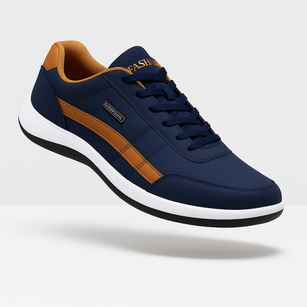 Deze sneakers combineren een strak silhouet met een robuuste uitstraling. Het contrast tussen het donkerblauwe bovenwerk en de cognackleurige accenten versterkt de sportieve look. De zool is stevig maar veerkrachtig, perfect afgestemd op dagelijks gebruik. Alles aan dit ontwerp straalt balans uit tussen comfort en zelfverzekerde beweging.