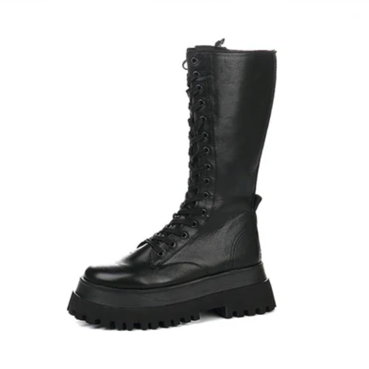 Deze laars heeft een hoge schacht met strakke vetersluiting die het been optisch verlengt. De stevige plateauzool geeft niet alleen hoogte, maar ook een krachtig gevoel van stabiliteit. De neus is afgerond met een robuuste afwerking voor een krachtige uitstraling. Dankzij de ritssluiting aan de zijkant trek je ze makkelijk aan en uit.